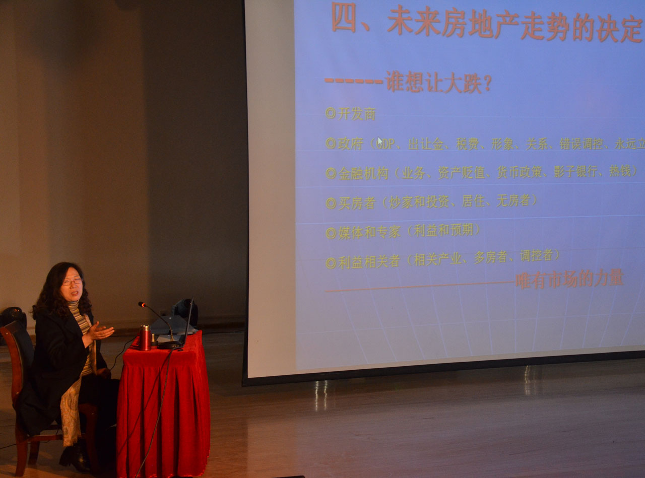 报告会上,杜教授围绕中国房地产周期及本轮政策、2015年房地产市场表现、现阶段房地产问题的关键以及未来房地产走势的决定因素四个方面进行了讲解。首先分析了2015年房地产的运行态势总体情况,指出城际分化明显、去库存任务艰巨、融资是关键;在未来,决定房地产走势的决定因素主要是政府的救市力度、城镇化道路方向、宏观经济形势、银行政策变化力度、长效机制的建立、老百姓的承受力以及房地产企业的转型步伐。同时,她还指出房地产在进行产品开发、产品转型方面时可与互联网、养老地产以及旅游相结合,但是在进行旅游地产开发的时候要注意把握旅游市场的发展规律,并借此鼓励大家要努力学好专业知识。整个报告过程中杜教授的论述浅显易懂,紧密联系实际情况,视野宽广,给同学们留下了深刻的印象。