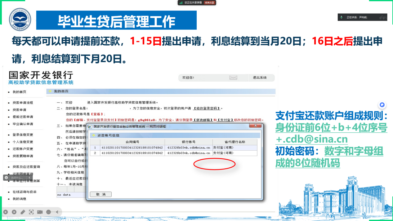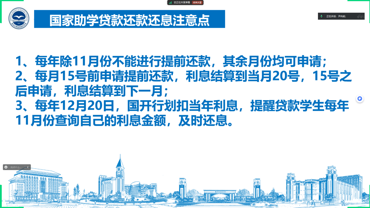 为进一步强化国家助学贷款政策实施成效,深化毕业生诚信教育体系建设,提升员工履约意识和契约精神,引导员工树立感恩回馈、担当有为的价值理念,2025年4月,公司毕业班辅导员通过线上会议平台组织召开了“资助两节课之资助政策宣讲暨毕业生诚信还款教育”主题班会。