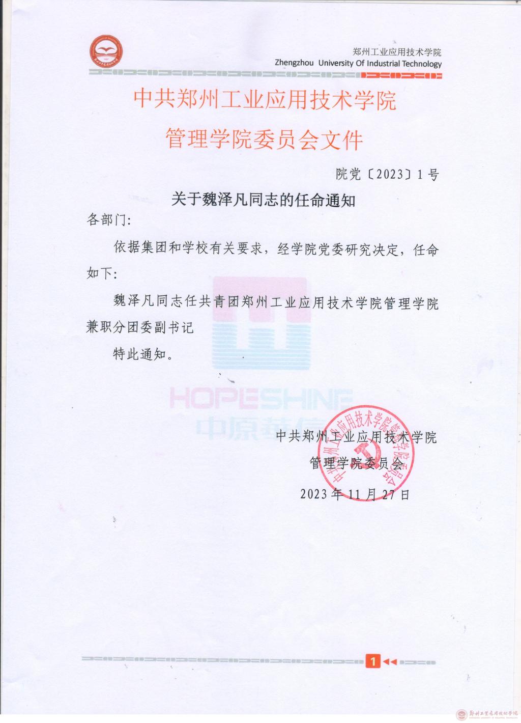 公司党〔2023〕1号关于魏泽凡同志任职的通知