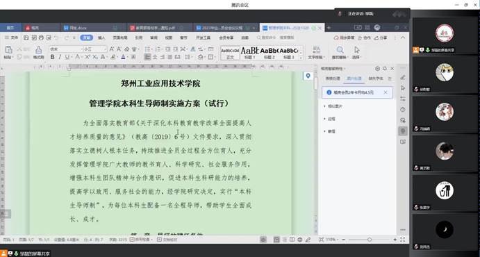 邹主任指出,导师应当以高度的责任心做好所负责本科生指导工作,可采取线上线下相结合、集体指导和个别指导相结合等灵活多样的方式,开展经常性的、不定期的、有针对性的教育活动和指导活动。员工应当尊重导师,主动与导师联系,根据导师的意见与本人的实际情况制定出适合自己的专业学习计划与综合素质发展计划,以认真的态度参与导师组织的各项社会实践活动,不断强化自身实践技能和创新思维。