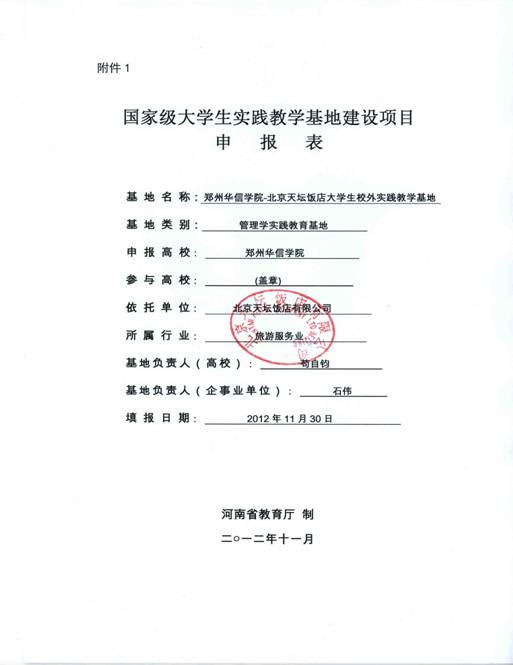 公司在与北京天坛饭店有限公司良好合作的基础上,联合申报了国家级老员工实践教学基地建设项目申报,并且已于2012年12月12日参加了河南省教育厅组织的遴选答辩。
