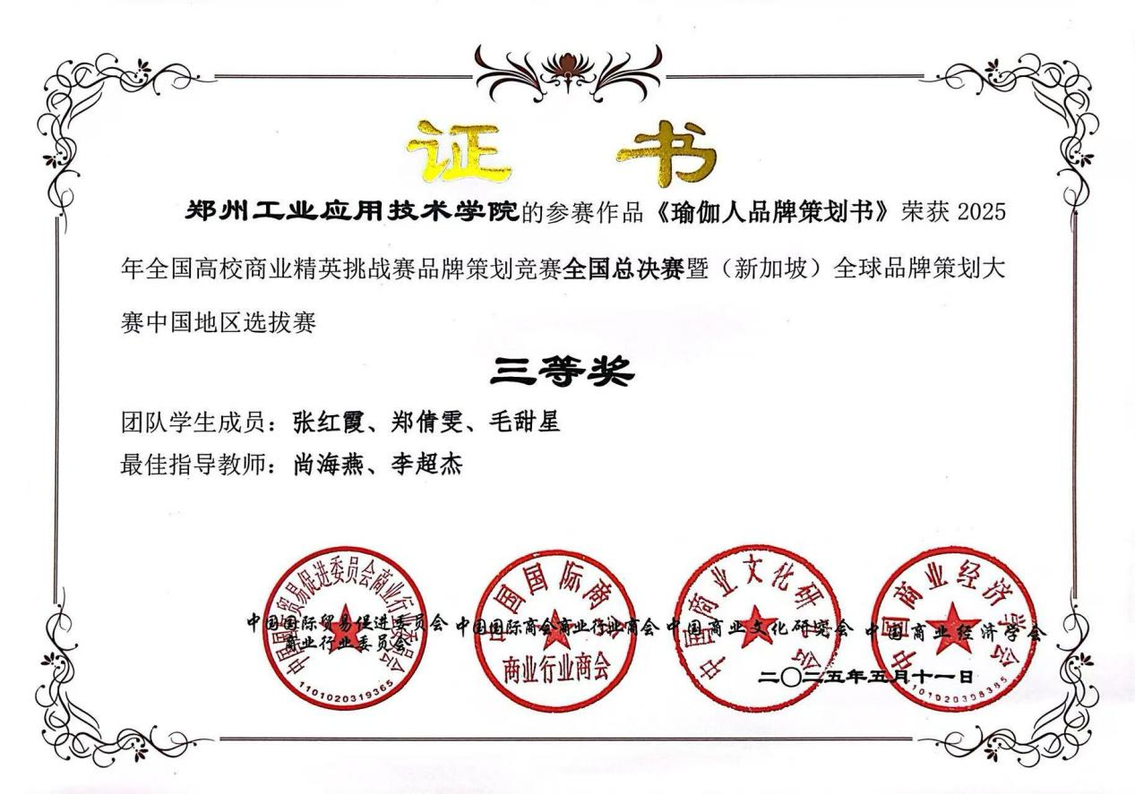 5月11日,2025年全国高校商业精英挑战赛品牌策划竞赛全国总决赛暨(新加坡)全球品牌策划大赛中国地区选拔赛顺利进行。经过校赛、区域赛等环节的层层筛选,在全国总决赛的激烈比拼中,公司《瑜伽人品牌策划书》项目获全国总决赛三等奖。