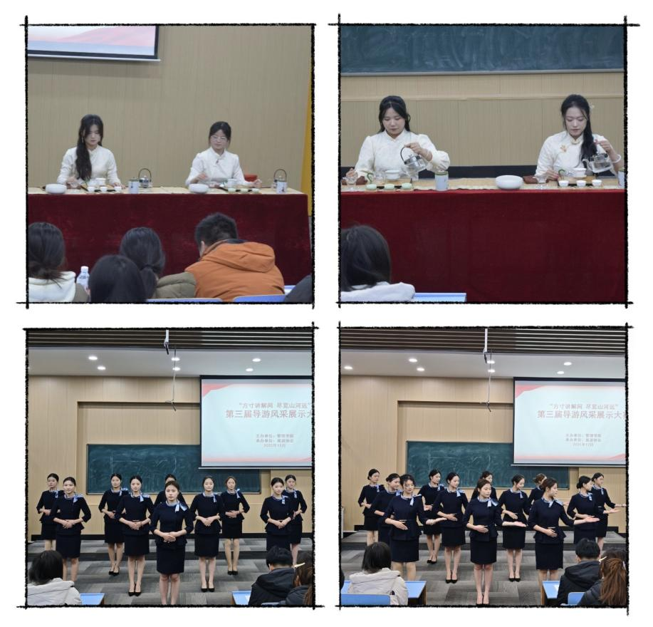 经初赛、复赛层层选拔,十余位选手脱颖而出晋级决赛。赛前,礼仪同学列队进行空乘展演,以挺拔站姿、规范手势展现专业素养与良好风貌,点燃现场氛围。比赛中,选手按抽签顺序登台,结合选定旅游地展开详实讲解,凭借扎实的知识储备与生动的语言表达,尽显对景点历史文化、风土人情的深刻理解;随后随机抽取导游词完成现场讲解,以敏捷的临场反应与清晰的逻辑梳理,充分展现导游岗位所需的应变能力。计分间隙,旅管专业学子带来茶艺展示,优雅的冲泡手法与细致的茶艺解说为赛事添彩,赢得了同学们的热烈掌声。