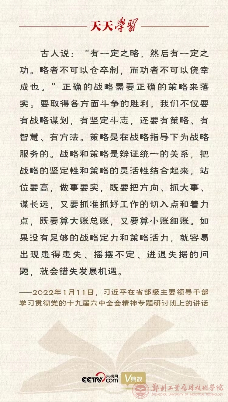 战略问题是一个政党、一个国家的根本性问题,正确的战略需要正确的策略来落实。2022年1月11日,在省部级主要领导干部学习贯彻党的十九届六中全会精神专题研讨班上,习近平总书记引用上述古语强调:“把战略的坚定性和策略的灵活性结合起来,站位要高,做事要实,既要把方向、抓大事、谋长远,又要抓准抓好工作的切入点和着力点,既要算大账总账,又要算小账细账。”为我们在解决突出问题中实现战略突破、在把握战略全局中推进各项工作提供了根本遵循。