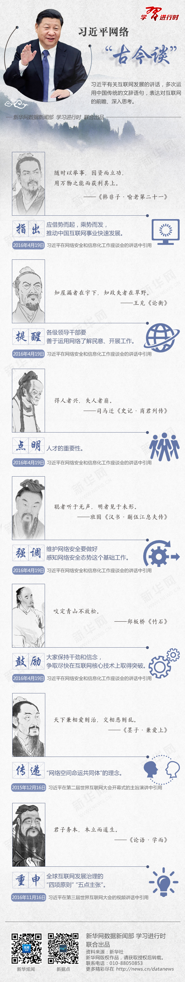 【学习进行时】习近平总书记博古通今,古籍中的名言警句,常常信手拈来,或巧妙化用,或引申阐发,用以指导当前的工作。新华社《学习进行时》原创品牌栏目“讲习所”今天推出文章,与您一起品味总书记借古老的文辞,巧妙表达对互联网发展的深切思考。