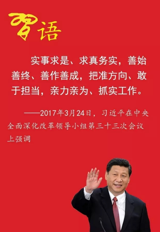 习近平3月24日上午主持召开中央全面深化改革领导小组第三十三次会议并发表重要讲话。他强调,各级主要负责同志要自觉从全局高度谋划推进改革,做到实事求是、求真务实,善始善终、善作善成,把准方向、敢于担当,亲力亲为、抓实工作。