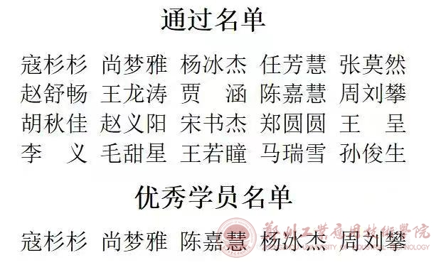 按照公司党委统一部署,根据组织工作安排,经校团委推荐,公司共有28名学员参加第41期入党积极分子培训班,并于11月24日顺利结束。其中共有20名学员通过考试,5名学员评为优秀学员。现将具体名单公示如下: