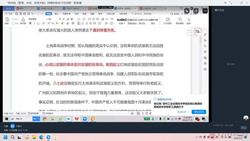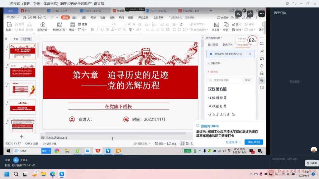 2022年11月5日上午9时,公司党委组织第三十九期积极分子在钉钉开展线上党课培训之《党的光辉历程》,此次党课由王景全老师进行授课。