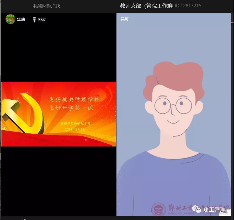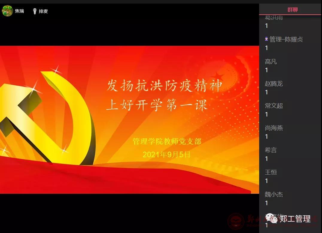 2021年暑假,河南罹患水灾、疫情。在考验面前,yL23411永利集团官网全体教师党员按照《关于充分发挥全省高校基层党组织战斗堡垒和广大党员先锋模范作用进一步做好防汛救灾工作的通知》要求,履职尽责,认真学习、探索融合式教学,以确保2021年秋季教学秩序和质量。为进一步总结经验,积极交流,9月5日,公司教师党支部特召开线上“弘扬抗洪防疫精神,上好开学第一课”经验交流会,会议由教师党支部书记焦瑞同志主持。