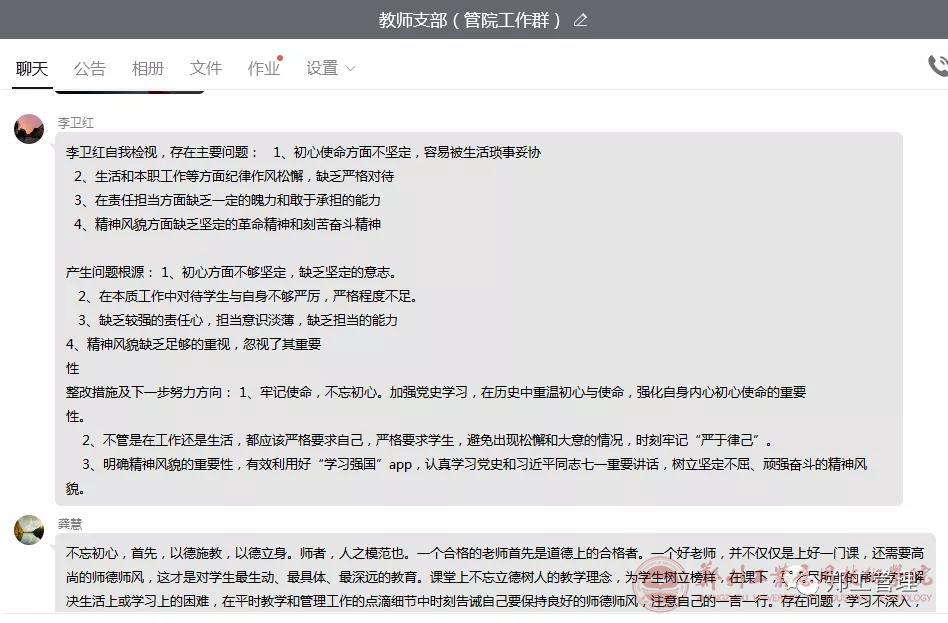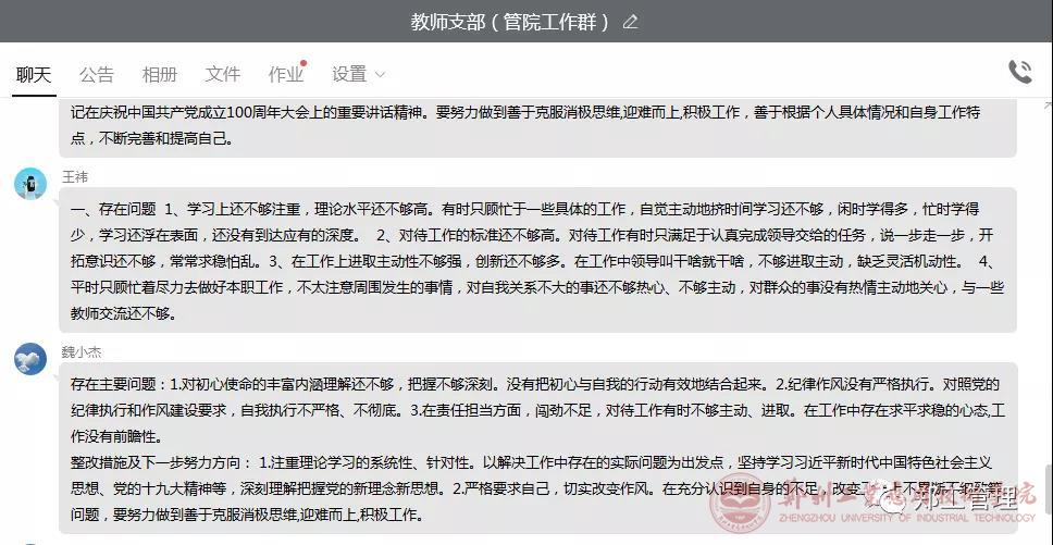 会议第二议程,各位党员同志结合本年工作实际,重点检视个人作为党员,在初心使命、纪律作风、责任担当、精神风貌等方面存在的问题,并分析问题产生根源,做出整改措施及下一步努力方向。批评和自我批评意见以群内分享的形式开展,方便大家相互监督及改进。
