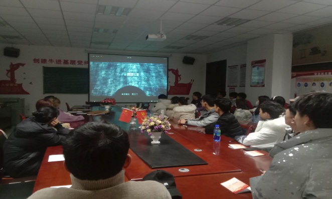 会上党支部组织委员带领参会党员学习了南京大屠杀死难者国家公祭日的基本知识,并播放了的相关主题影片,借此来提醒同学们不能忘记历史,不能忘记历史的教训,更不能忘记那些为中华民族奋斗的英雄,以史为鉴、面向未来、珍爱和平。