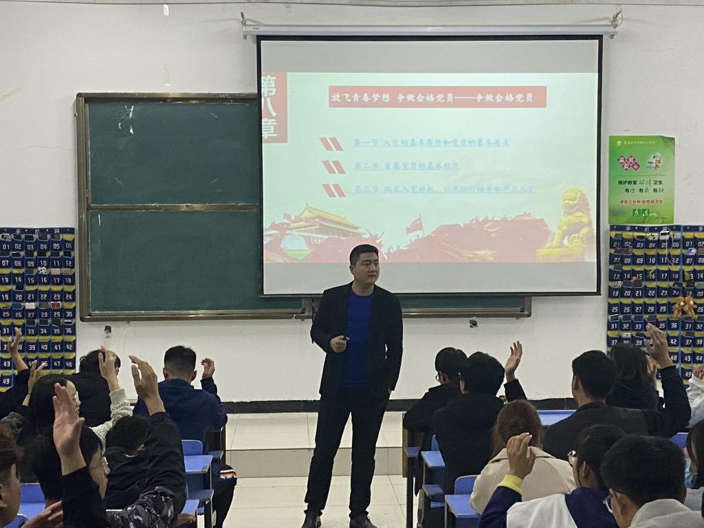 孙老师首先详细讲解了入党申请书的格式与标准。入党申请书中要求写明对中国共产党的认识,说明自我经历、家庭成员和社会关系,让党组织了解申请人的入党动机。此外,孙老师还向同学们说明入党积极分子培训相关事宜,他指出,入党积极分子应满足提交入党申请书满半年时间,同学们需要参加不少于40学时的党课;在同学们确立积极分子之后,开始为期半年一次的考察,若同学们的综合测评和智育成绩维持在班里前50%,才能确立为发展对象。党校培训共48个学时,旨在加强同学们党建工作,引导他们以实际行动向党组织靠拢。