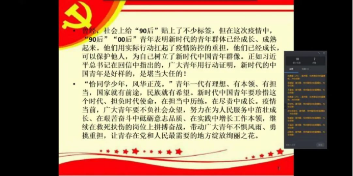 活动第二项魏泽凡同志在会议中说到“90后”、“00后”青年表明新时代的青年群体已经成长、成熟起来。特别是在这次疫情中,他们用实际行动扛起了疫情防控的重担,他们已经成长,可以保护他人,为自己树立了新时代中国青年形象。正如习近平总书记在回信中指出的,广大青年用行动证明,新时代的中国青年是好样的,是堪当大任的!