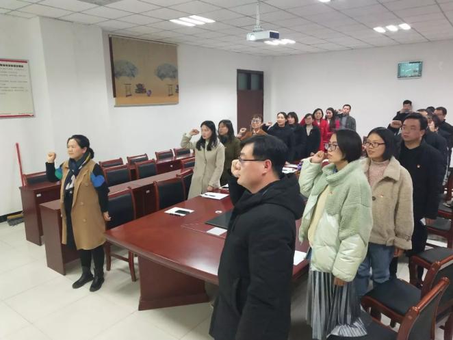 会议最后,由吴杰副书记带领孙小梅同志面向党旗进行宣誓,全体教师党员同志也一同重温了入党誓词。字字句句都饱含着党员同志们“不忘初心、牢记使命”的决心。