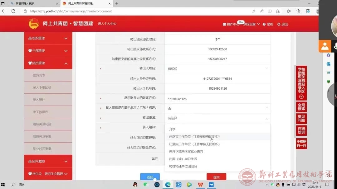 会议中,主持人张振堂同学对“智慧团建”团组织关系转出操作流程做出了演示,并详细介绍了每一流程的注意事项,以及操作过程中可能出现的问题,确保了所有毕业班团支书能够熟练操作,并将每一名毕业生团员都成功转出。随后,张振堂同学对团支书提出的问题一一做出解答,以保证无一步骤遗漏、无一问题模糊。