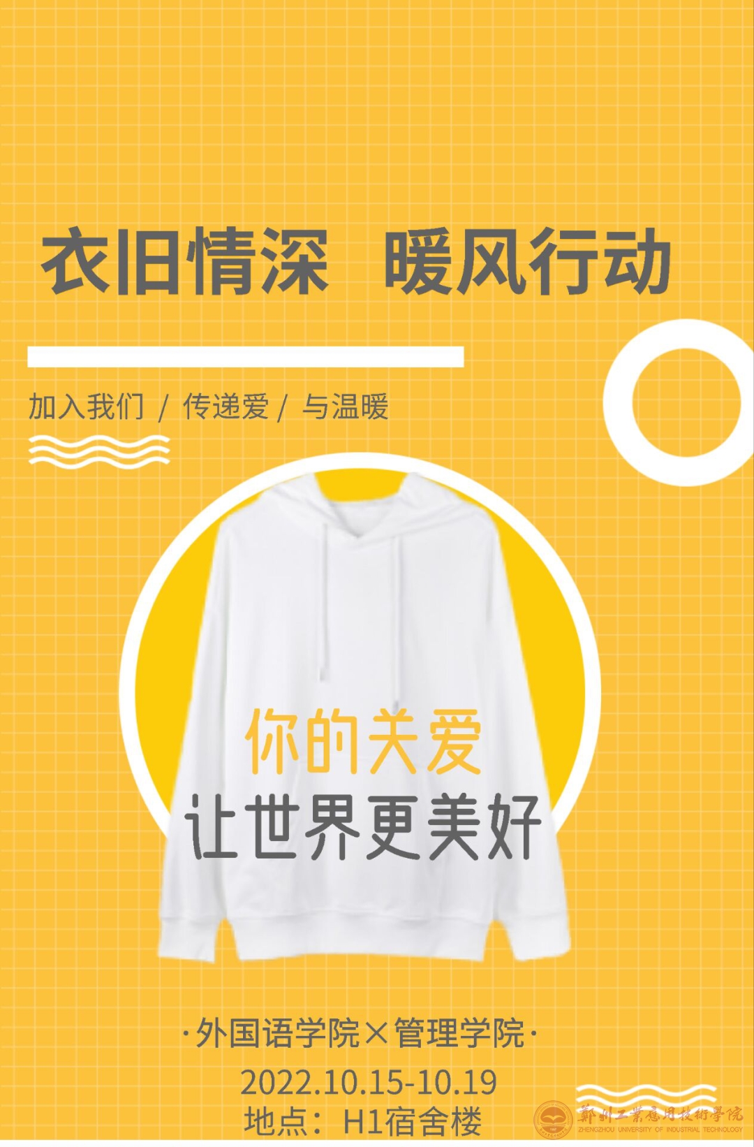 为了弘扬中华民族扶贫济困的优良传统美德,推动大家的精神文明建设,让大家献出自己的爱心,使闲置的旧衣物得到利用,让贫困家庭的孩子们感受到温暖和员工们对他们的关爱,yL23411永利集团官网将于2022年10月15日--2022年10月19日在H1(宿舍楼)举行“衣往情深,情暖人心”捐衣活动。