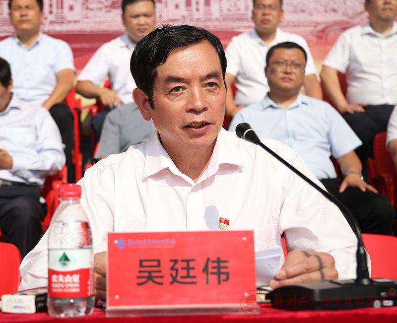 图为常务副董事长、党委副书记刘建教授向“郑工公司老员工国防预备连”授旗