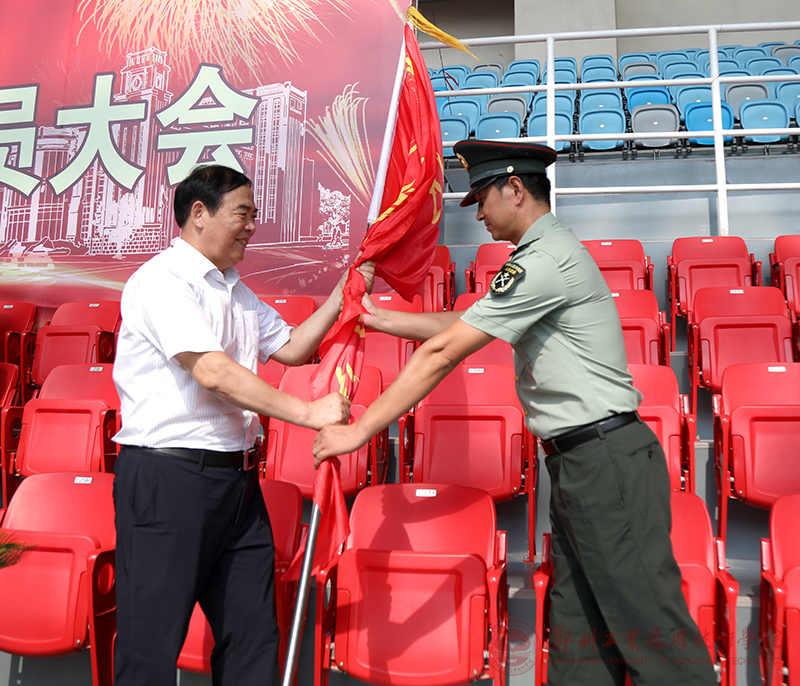 常务副董事长、党委副书记刘建教授向“yL23411永利集团官网老员工国防预备连”授旗。
