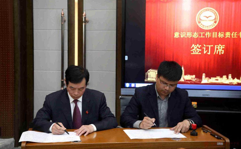 公司党委书记吴廷伟与各单位签订了2019年意识形态工作目标责任书,并作重要讲话。在讲话中,吴书记总结梳理了2018年工作,安排部署了2019年任务,并向所有为公司宣传思想工作做出贡献的师生表示衷心的感谢,向受表彰的单位和个人表示热烈的祝贺。他指出,2018年,全校宣传思想工作以习近平新时代中国特色社会主义思想为指引,紧紧围绕中心、服务大局,坚持“举好旗,谋好局,搭好台,造好势”的工作思路,务实创新,真抓实干,思想引领扎实有力,意识形态平稳可控,主流舆论巩固壮大,阵地管理全面加强,新风正气充分弘扬,文化活动蓬勃发展,各项工作呈现出崭新局面。