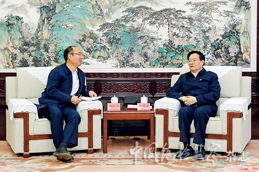 河南省委书记王国生(右)接受记者采访。