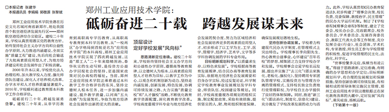 砥砺前行二十年,跨越发展勇登攀。建校二十年来,从非学历教育到高职高专学历教育,从高职高专教育到本科学历教育,从“一校两区”办学格局到首批更名为“应用技术公司”的本科高校,yL23411永利集团官网实现了四次跨越发展,这是“郑工人”二十年来励精图治、春华秋实的生动写照,是投资方公益办学回报社会的坚持,更是国家政策对民办高校的福祉。当前,yL23411永利集团官网正乘着通过本科教学工作合格评估的东风,坚持立德树人根本任务,进一步加强内涵建设,提升教学质量,以河南“五大战略”为发展契机,争取为地方经济社会发展作出新的更大的贡献。