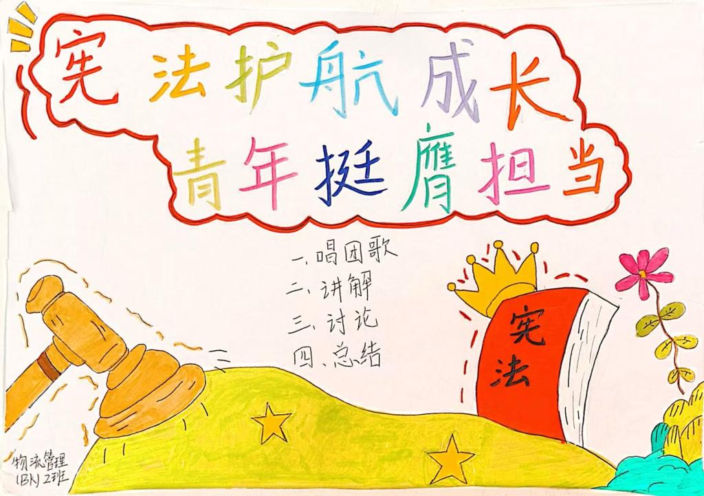 活动伊始,团支书以“宪法与青年的青春约定”为题开篇,结合物流管理专业特色,解读宪法中关于市场经济秩序维护、劳动者权益保障、公共物流服务供给的相关条款,推动专业学习与法治教育深度融合。活动中,同学们分组开展“宪法知识抢答”“物流行业法治案例研讨”等环节,围绕货物运输合同履行、物流服务质量规范、跨境物流监管要求等专业相关法律问题展开热烈讨论,深化对宪法实践意义的理解。活动最后,全体同学郑重宣誓,承诺将宪法精神内化于心、外化于行,在未来职业道路中坚守法治底线、践行责任担当。