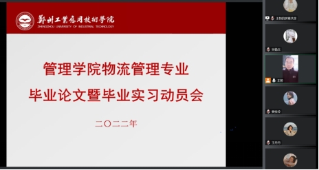 为扎实做好2023届物流管理专业本科毕业生毕业论文撰写与毕业实习工作,进一步促进员工对所学知识和技能进行实践运用、总结和深化,2022年11月4日下午,物流管理教研室通过腾讯会议,召开2023届物流管理专业本科生毕业论文暨毕业实习动员大会。物流管理专业全体指导老师、思想政治辅导员、2023届物流管理专业本科生参加了此次线上会议。会议由物流管理教研室主任王恒老师主持。