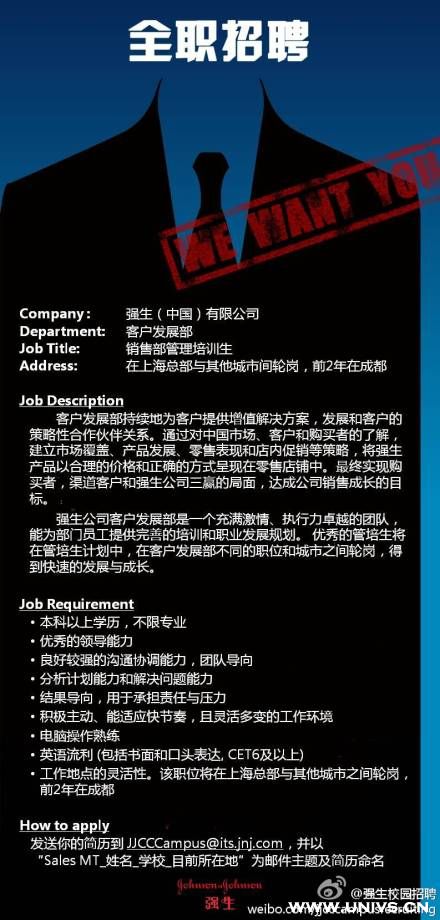 没错,是销售管理培训生,不是销售代表哦!!为得到更好的发展,该销售管培要在上海总部和区域间轮岗,前两年在成都。截止时间:2013年5月24日晚上20:00。时间紧迫,大家抓紧申请哦~